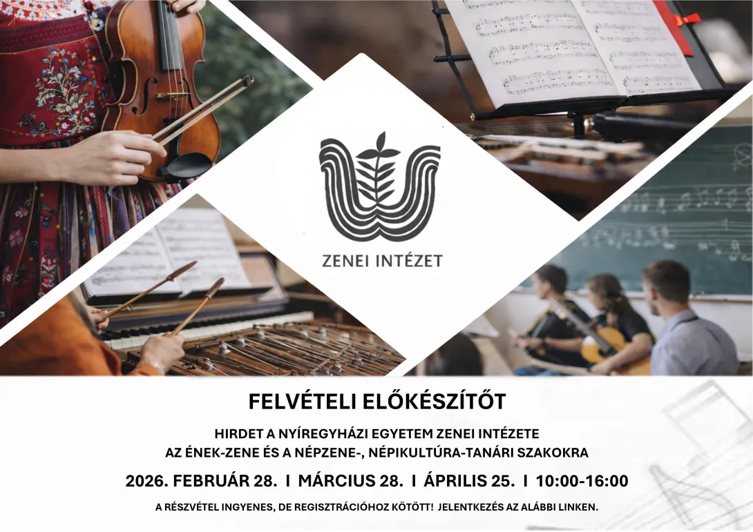 Az ének-zene tanári és a népzene- és népikultúra-tanári szakokra jelentkezők gyakorlati vizsga teljesítésével nyerhetnek felvételt a Nyíregyházi Egyetemre. A Zenei Intézetünk segít felkészülni a vizsgára -- az érdeklődőknek csupán regisztrálniuk kell a következő linken: https://forms.gle/hzH91S3o5uGqrK137